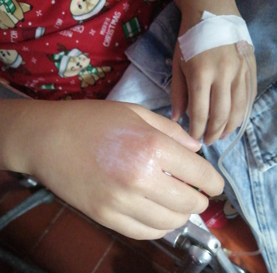 Buscando una toalla colocada sobre una silla, Gabriela (de 22 años), sintió un pinchazo doloroso que le puso caliente su mano derecha en forma inmediata y le causo un dolor indescriptible, cuando miró su mano estaba hinchada y roja, recuerda que sintió mucho miedo porque sabe de su condición alérgica a la picada de insectos (abejas y hormigas), sin saber qué fue lo que la picó, simplemente empezó a llamar a todos en casa.