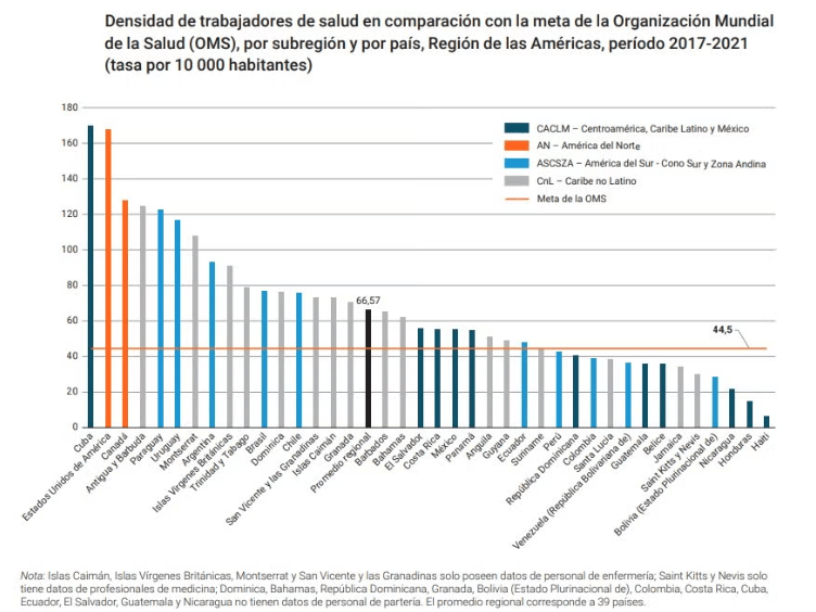 Con una densidad promedio de 66,57 trabajadores de salud por cada 10.000 habitantes, las Américas superan el umbral de la Organización Mundial de la Salud (44,5). Sin embargo, persisten grandes desigualdades: mientras países como Haití (6,38) y Honduras (7,13) enfrentan carencias críticas, Cuba y Estados Unidos casi cuadruplican la meta. Factores como la limitada capacidad formativa, el envejecimiento de la fuerza laboral, la migración (especialmente en el Caribe) y la distribución desigual amplían la brecha.