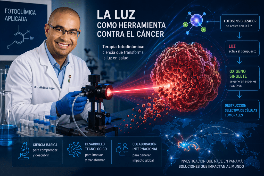 Convertir la luz en una herramienta capaz de eliminar células tumorales es el eje del trabajo del Dr. José Robinson Duggon, quien lidera en Panamá una línea de investigación única en fotoquímica aplicada. Sus avances en terapia fotodinámica no solo fortalecen la capacidad científica nacional, sino que proyectan soluciones innovadoras frente a enfermedades de alto impacto, integrando ciencia básica, desarrollo tecnológico y colaboración internacional.